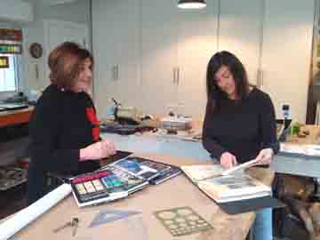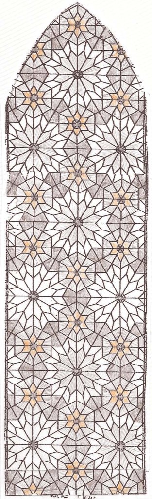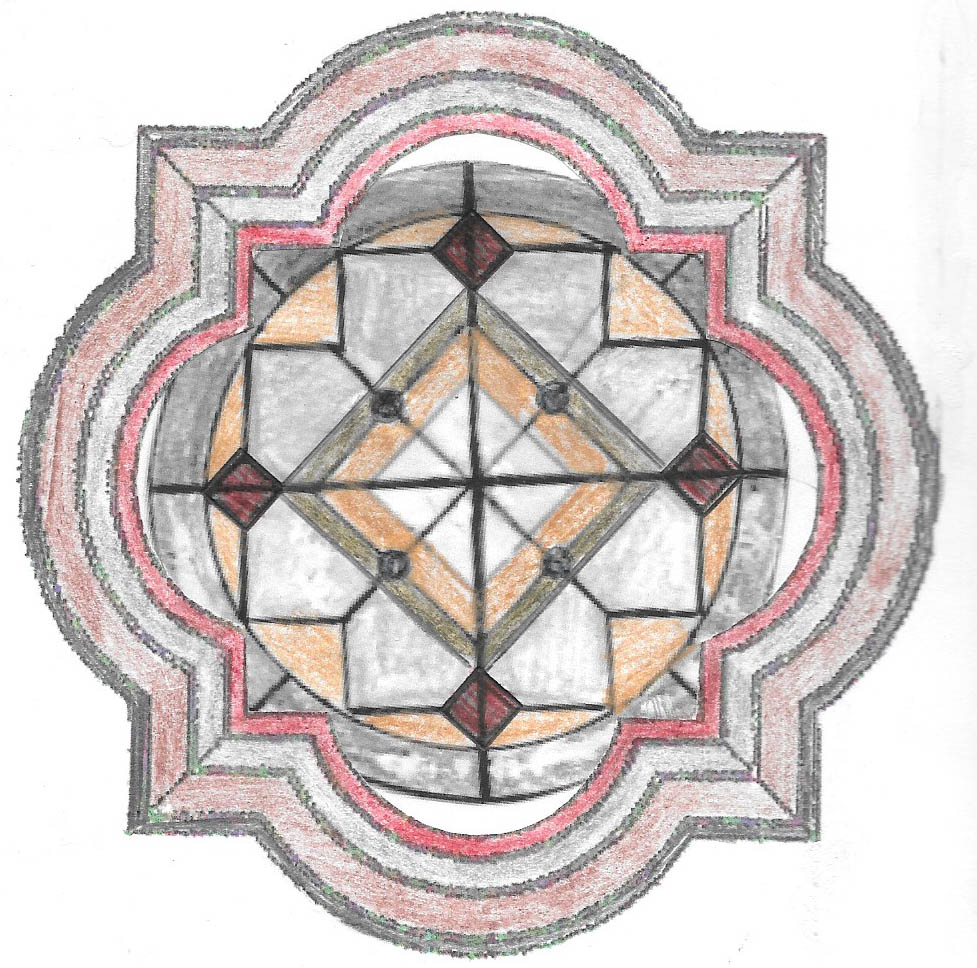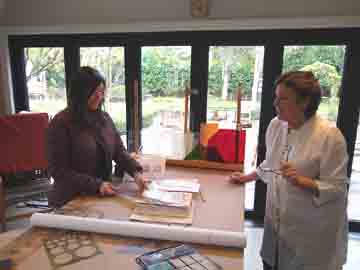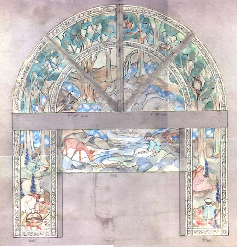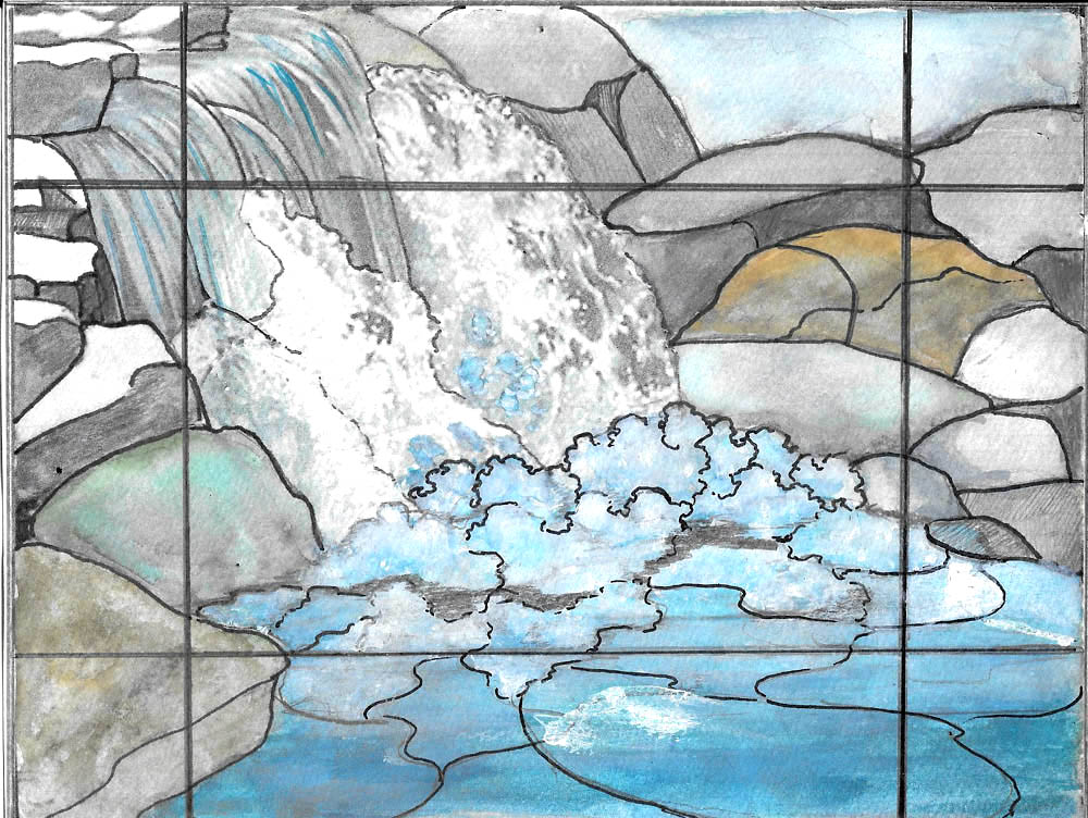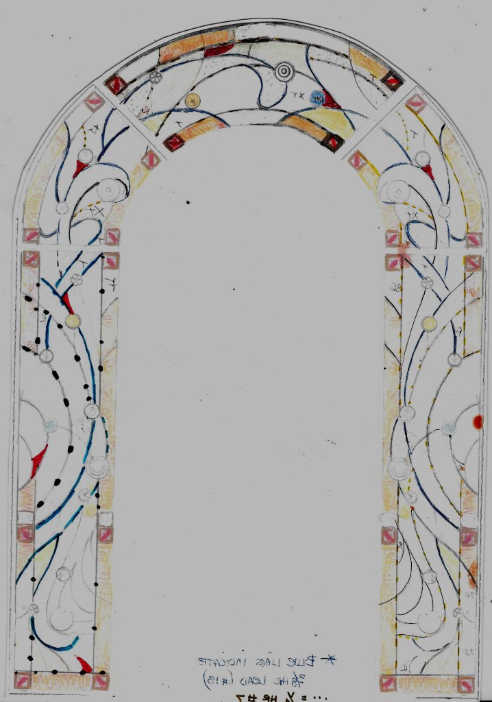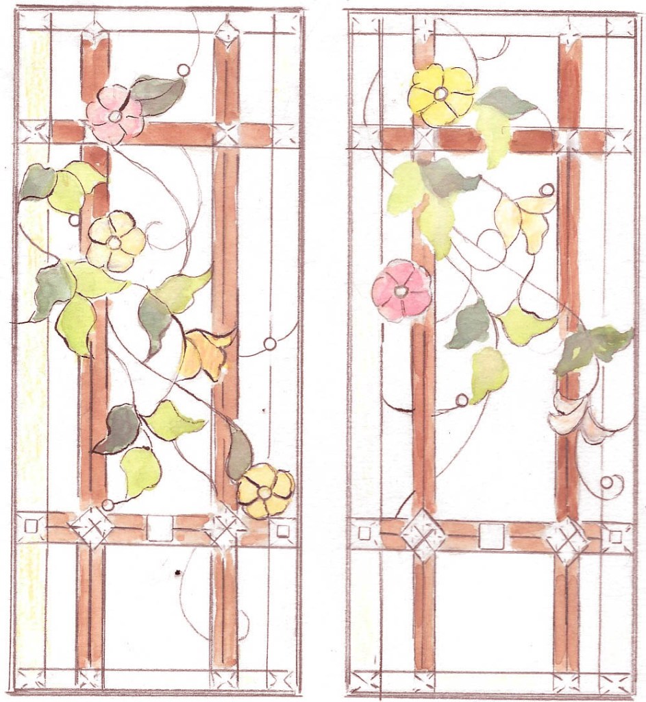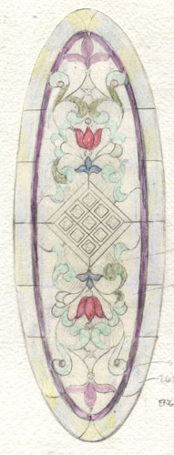 The next stage is the preparation of a small scale drawing. This drawing is done in watercolors and inks, which gives an accurate visualization of the finished window. Art glass samples, clear, textured, or colored, are presented for approval. Important aspects are considered and discussed, such as degree of privacy desired, color palette to complement the home decor, and ambient light available. The glass must take advantage of strong sunshine and cool shadows, twilights and high noon.